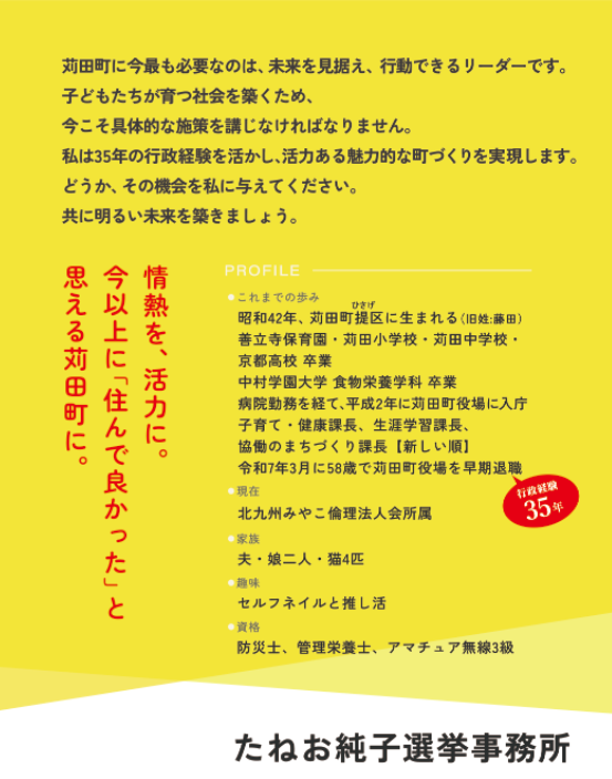 本日、苅田町町長選の告示があり、たねお純子が出馬させていただくことになりました。